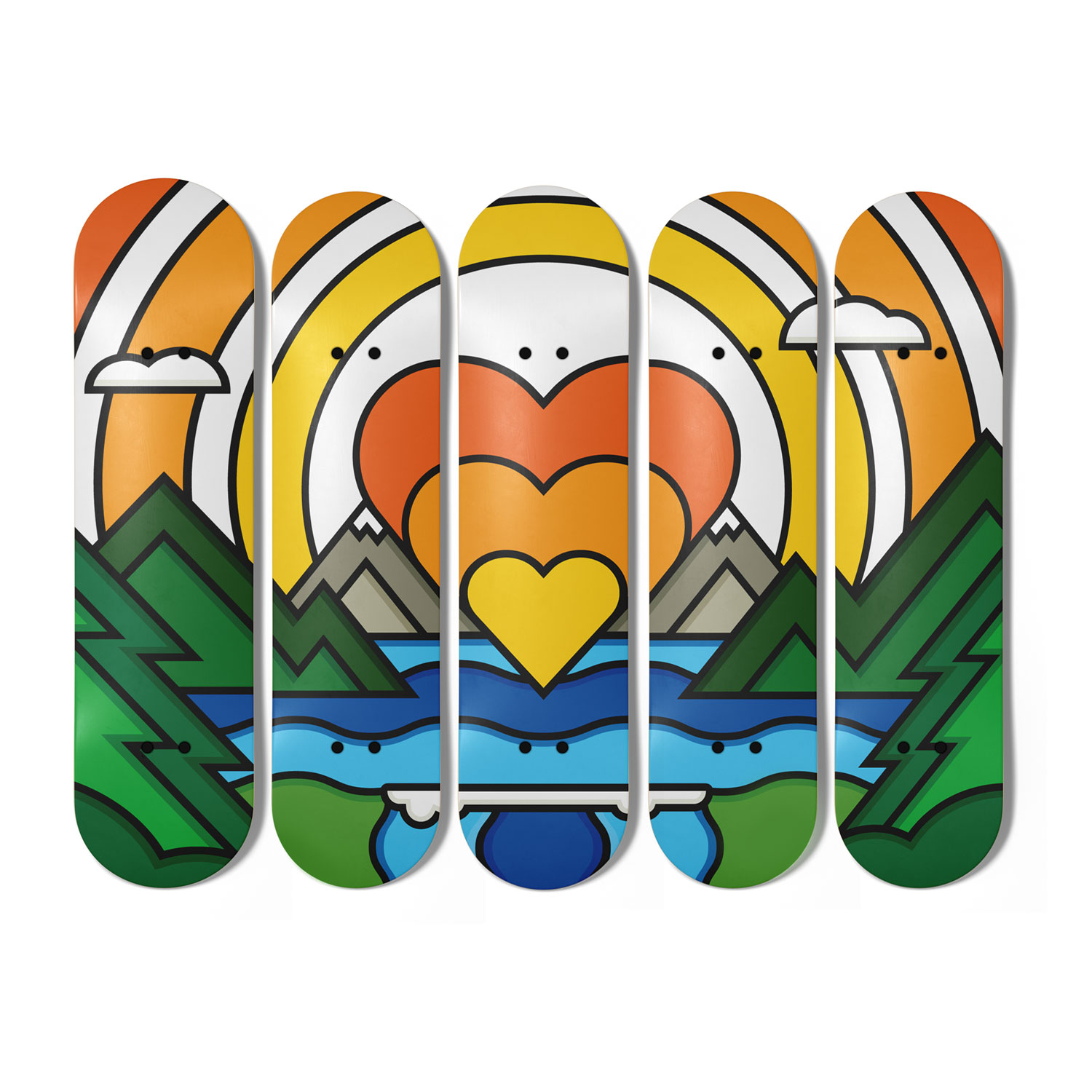 Wood (maple) and vinyl, set of 5 skateboards Dimension: