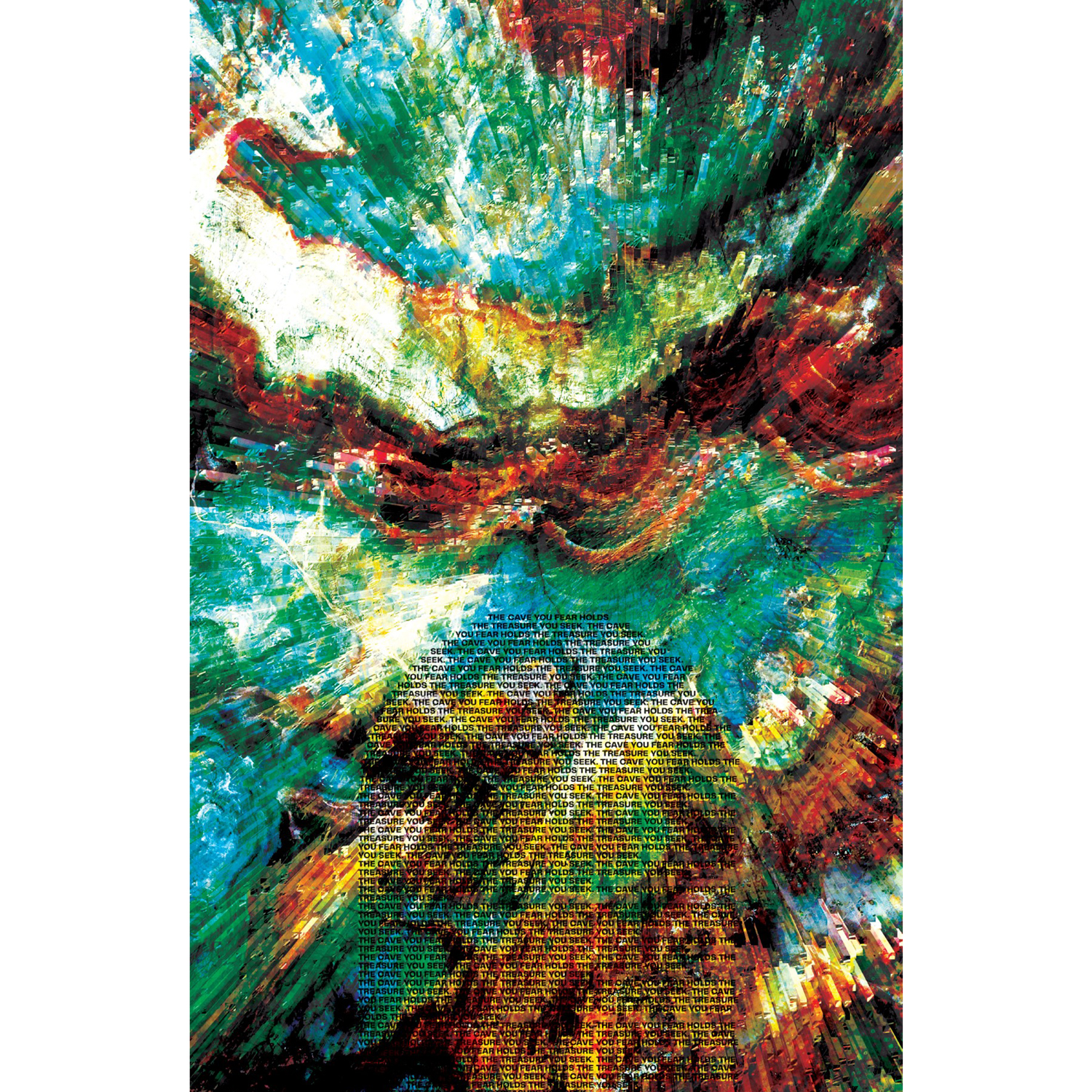 The cave represents adversity and is symbolised through the colourful and sedimentary rock-like background. The cave, even though it is feared, contains exactly what we need—the treasure we seek. Will we explore what is within, or will we only peek inside the fear of the unknown?
